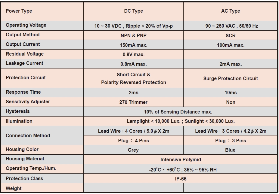 8.特點:感應距離:0.1M〜2.0M、交流電入力、感度調、IP-66